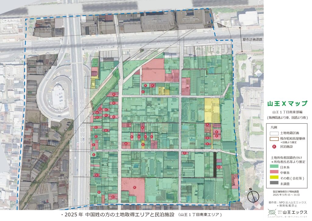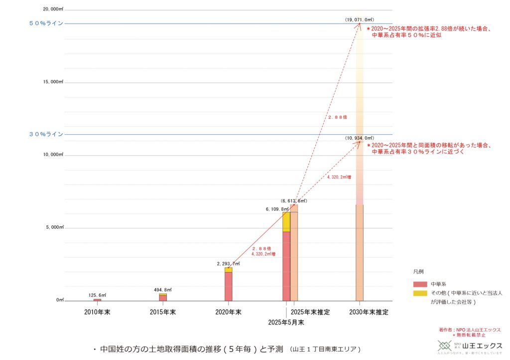 調査レポート 2025.09.10 山王エックスによる山王町調査レポート 山王1丁目南東部エリア 2025年 中国姓の方の土地取得エリアと民泊施設(山王1丁目南東部エリア) 国籍(推定)別の土地取得の推移 エリアと面積円グラフ(山王1丁目南東部エリア) 中国姓の方の土地取得面積の推移(5年毎)と予測(山王1丁目南東部エリア) 民泊施設リスト(大阪市資料より抜粋)